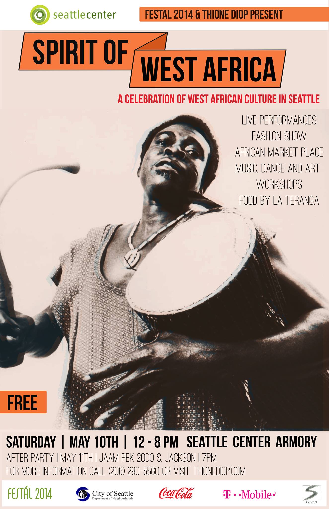 Thione Diop and Seattle Center FESTAL are proud to present the 9th Annual Spirit of West Africa Festival on Saturday, May 10, 2014 at the Seattle Center Armory from 12:00 to 8:00 pm. Showcasing the profound creativity and cultural resilience of peoples of West African origin and descent, The Spirit of West Africa will present a vibrant and unique celebration featuring unparalleled music and dance performance, an African marketplace, an art gallery, a fashion show and traditional Senegalese cuisine, not to mention free dance workshops.